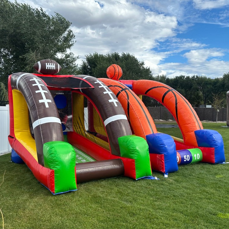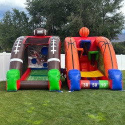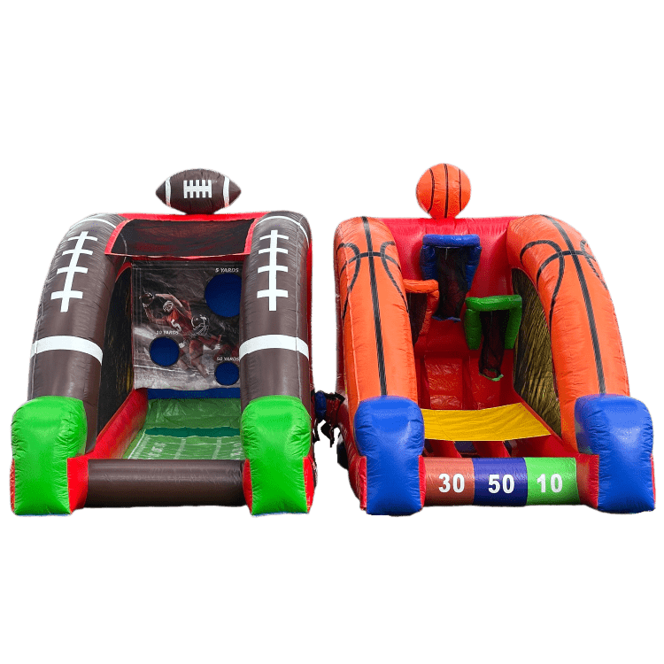 Standing 12 ft tall, 9 ft wide, and 14 ft deep each, these two oversized inflatable sports games make an impressive side-by-side attraction at any event. The bundle includes three basketballs and three footballs, giving guests plenty of action in both the basketball shootout and football toss.